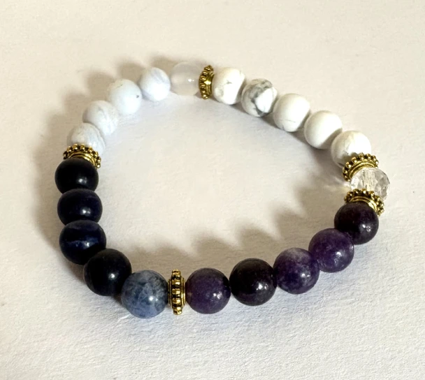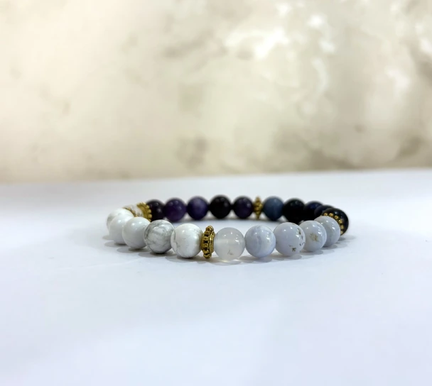 The Sodalite Lepidolite Howlite combo includes Sodalite, Lepidolite, Howlite, Blue Lace Agate, and Clear Quartz, providing solid control on the emotional toll, overthinking thoughts, and rushed feelings. This bracelet for calm and emotional release is ideal for those dealing with day-to-day anxiety and stress.