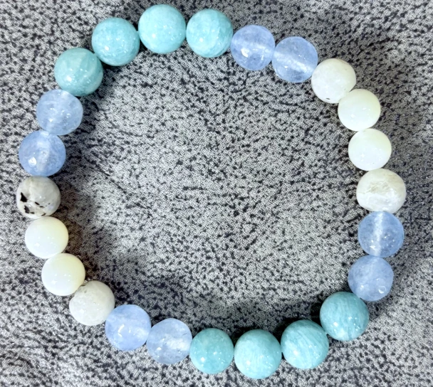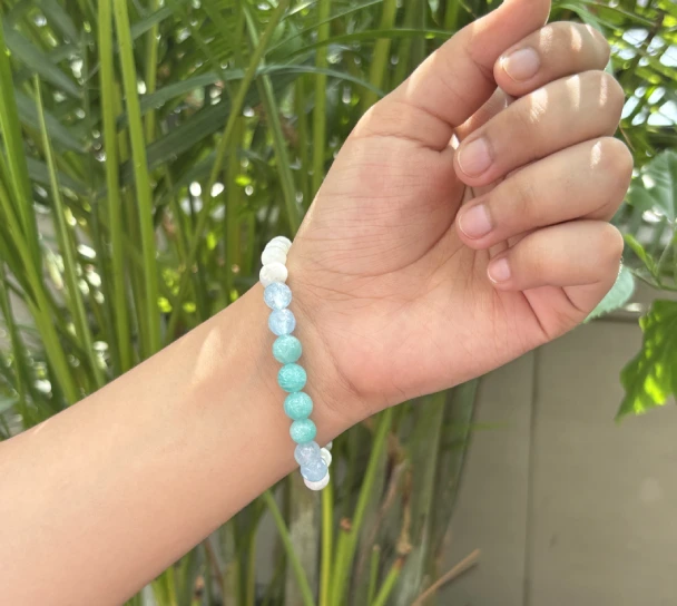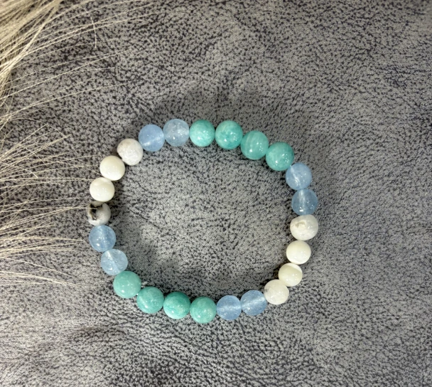 Designed with Amazonite, Rainbow Moonstone, Aquamarine, and Mother of Pearl, this emotional healing bracelet allows you to feel stable, calm, connected, and supported. This bracelet of emotional flow also soothes high levels of anxiety and promotes emotional balance.